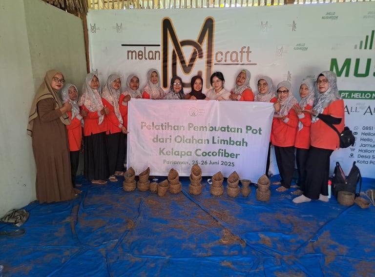 Pelatihan pengolahan produk turunan ini dilaksanakan selama dua hari, melibatkan perwakilan perangkat desa, Dinas Lingkungan Hidup Kabupaten Padang Pariaman, serta 15 anggota KWT Mama Ceria. Melalui pelatihan ini, para anggota kelompok mulai memahami bahwa meskipun cocofiber sulit dijual dalam bentuk mentah, pengolahan lebih lanjut dapat meningkatkan nilai jualnya secara signifikan.